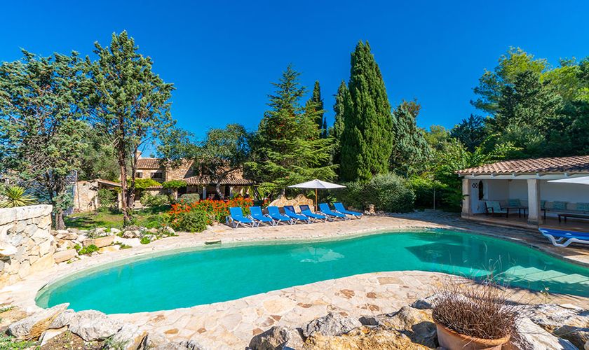 Das Highlight ist der wundervolle Poolbereich: Der großzügige, 8-förmig geschwungene Swimmingpool (ca. 10m lang, 1,50m bis 3,00m tief) ist geschickt in die felsige Landschaft integriert und bietet einen phantastischen Blick auf das Tramuntana-Gebirge. Der Pool wird umweltfreundlich mit Salzwasser gereinigt. Das angrenzende Poolhaus mit 20 Liegen lädt zum Entspannen ein, wobei die abendlichen Sonnenuntergänge besonders hervorgehoben werden. Eine Tischtennisplatte sorgt für Unterhaltung.